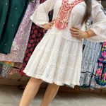 Attractive cotton single piece cotton dress with thread & hand work on upper part with shifli cotton work on dress with matching bell sleeves.