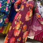 Attractive 3pc chinnon alia cut dress with digital print pattern on all over the kurta with hand work on upper part with matching plain pants & dupatta.