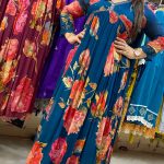 Attractive 3pc chinnon anarkali pant set with alia style hand work on upper part with digital print pattern on all over the kurta with matching pants & dupatta.
