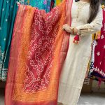 Out of StockAttractive silk 3pc pant set with hand work on upper part with tussles work on sleeves with matching laces & plain pants with matching print pattern on all over the contrast dupatta.