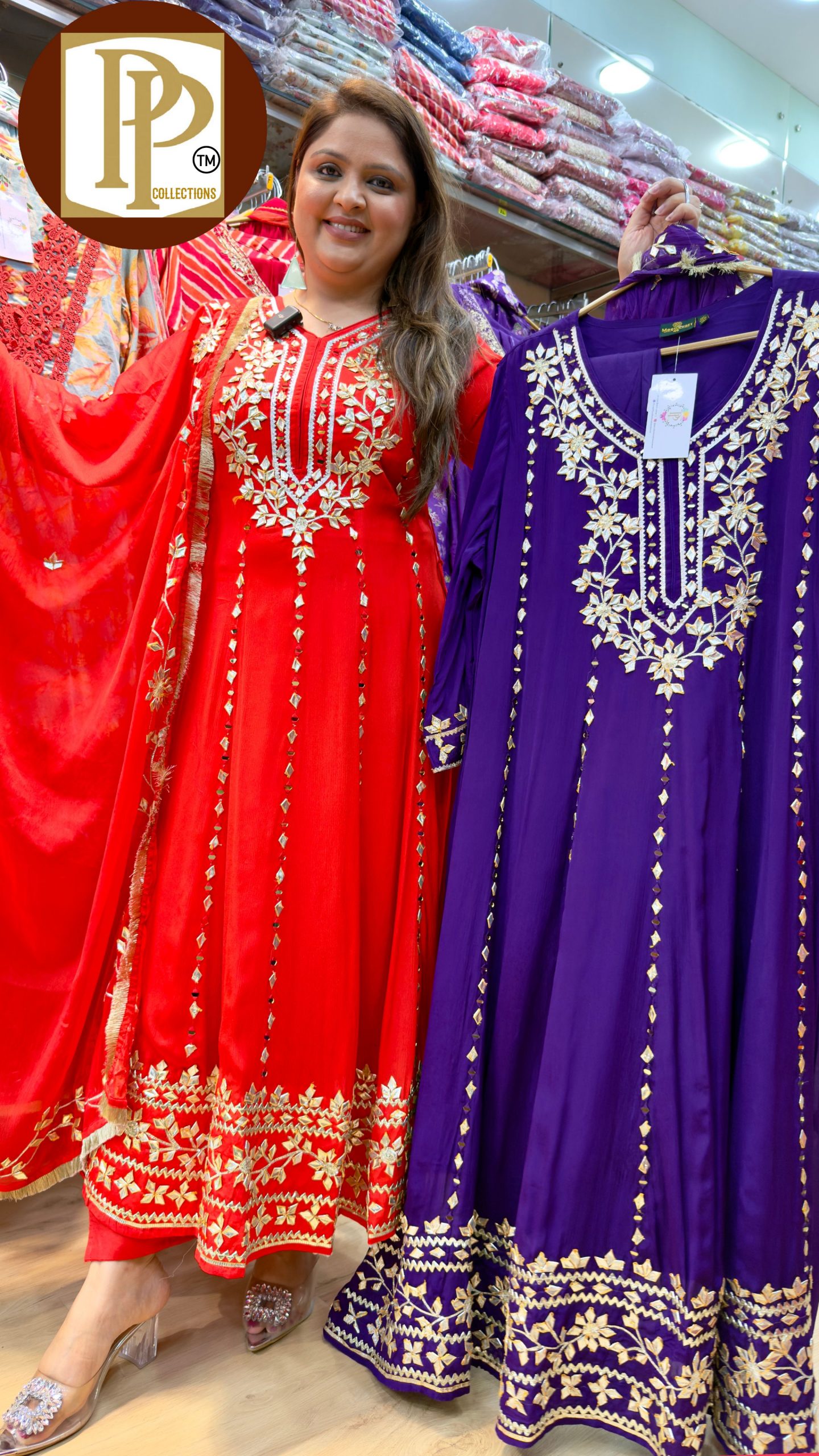 Description : 3piece Pant Set Fabric Type : Chinnon Style : Anarkali Set Work Type : Gota Pati Laces & Original Mirror Work With Matching Dupatta.