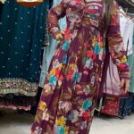 Out of StockAttractive 3pc chinnon digital printed naira cut with original mirror work around the pads with digital print on all over the kurta with matching pants & dupatta.
