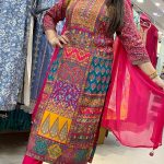 Attractive 3pc muslin cotton pant set with hand work on upper part with print pattern on all over the kurta with matching plain pant & matching dupatta.