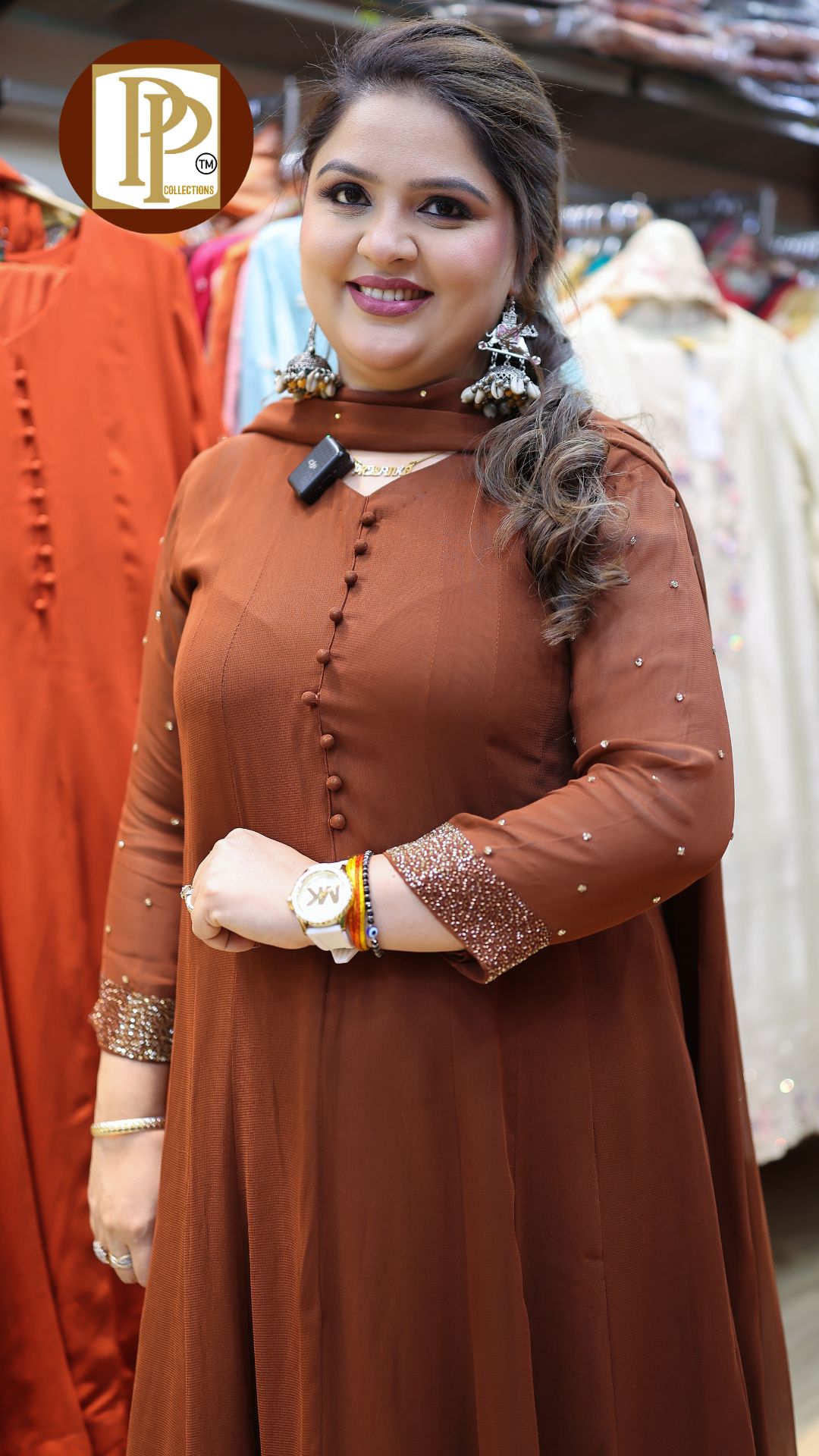 Work Type : handwork button stone work in sleeves in Anarkali with matching pants & dupatta .