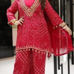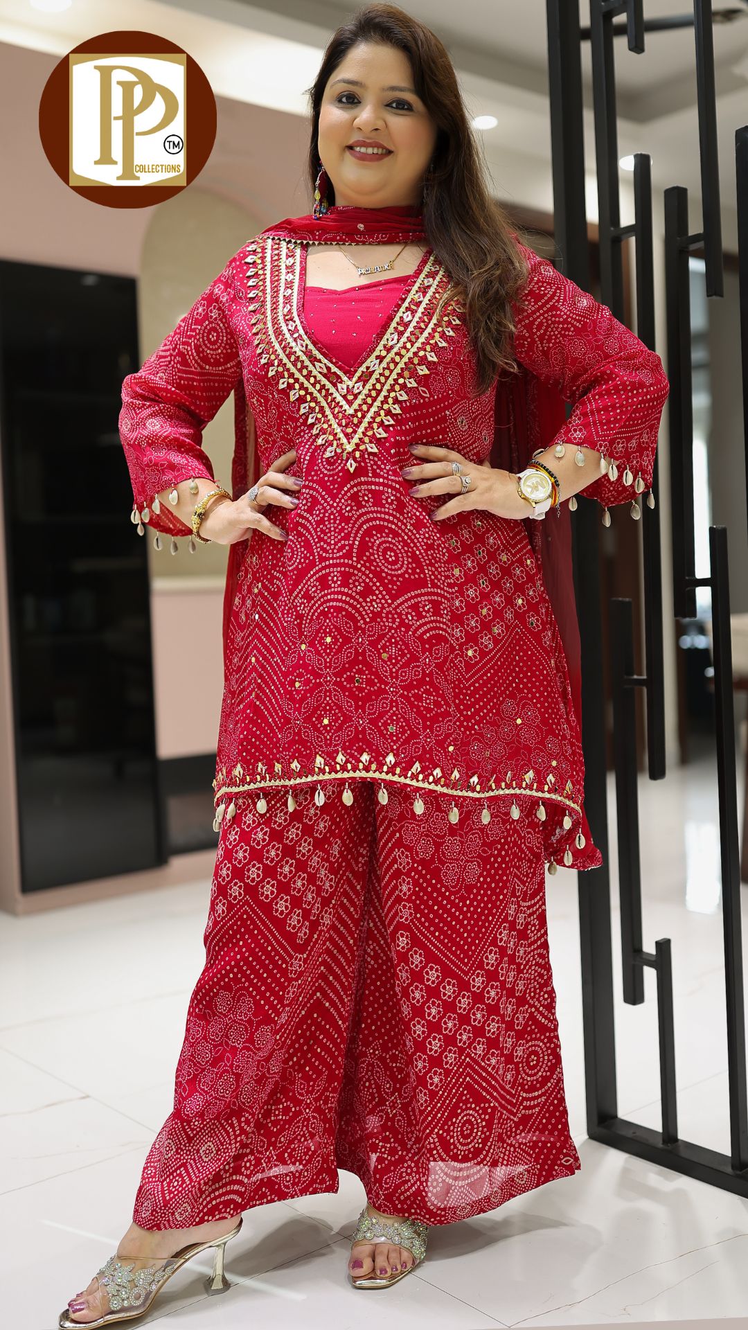Work Type : all over bandini print handwork original mirror work in kurta with matching divider & dupatta.