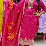 Description : 3piece Pant Set Fabric Type : Bandhej Style : Stright Set Work Type : Zari & Sippy Work With Matching Digital Print Dupatta.