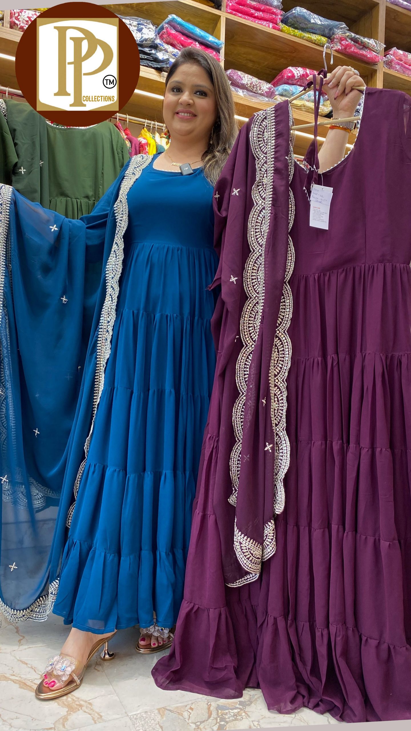Description : 2piece Gown Fabric Type : Georgette Style : Anarkali Set Work Type : Frill Style With Have Zari & Sippy Work Matching Dupatta.