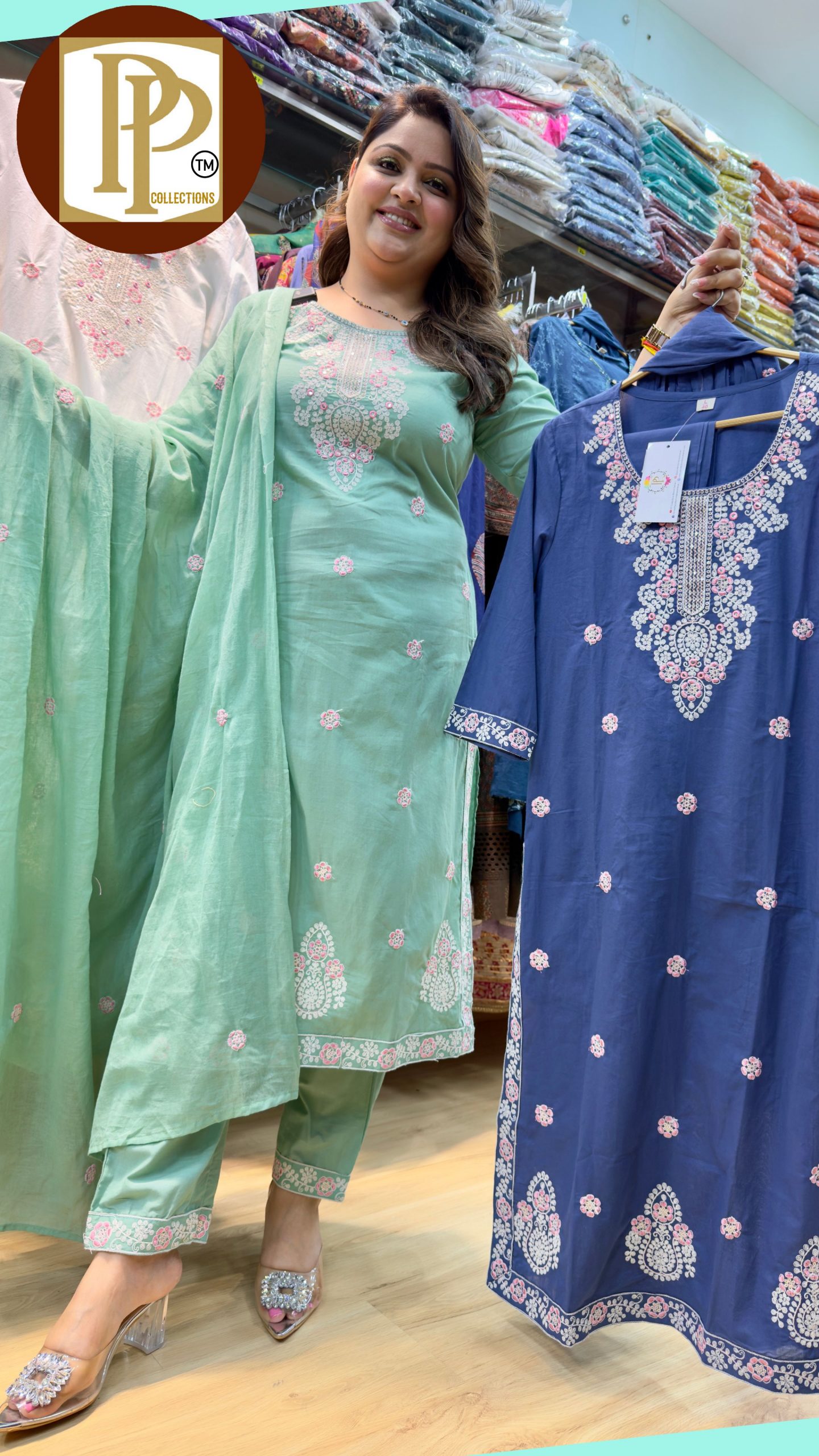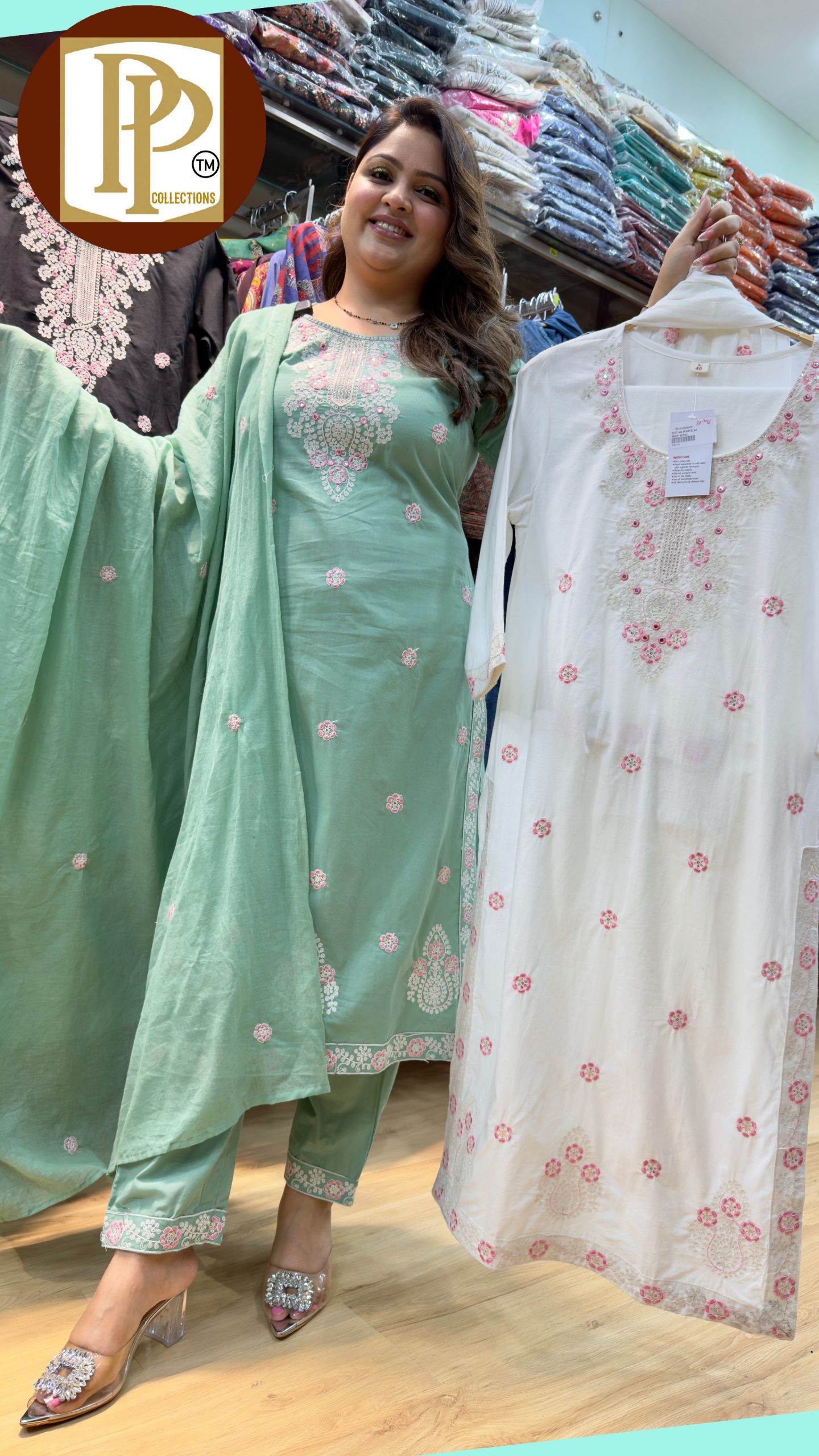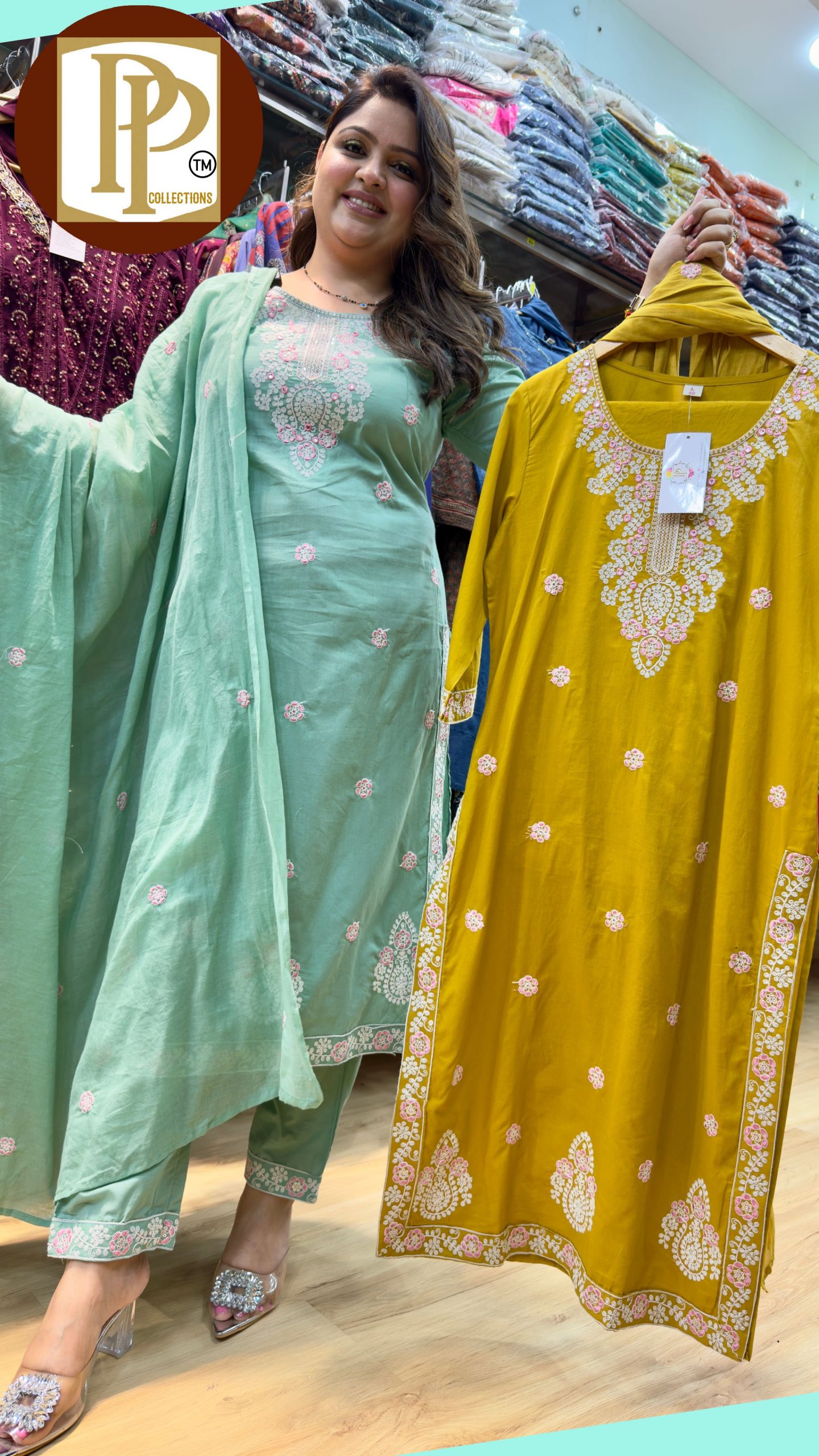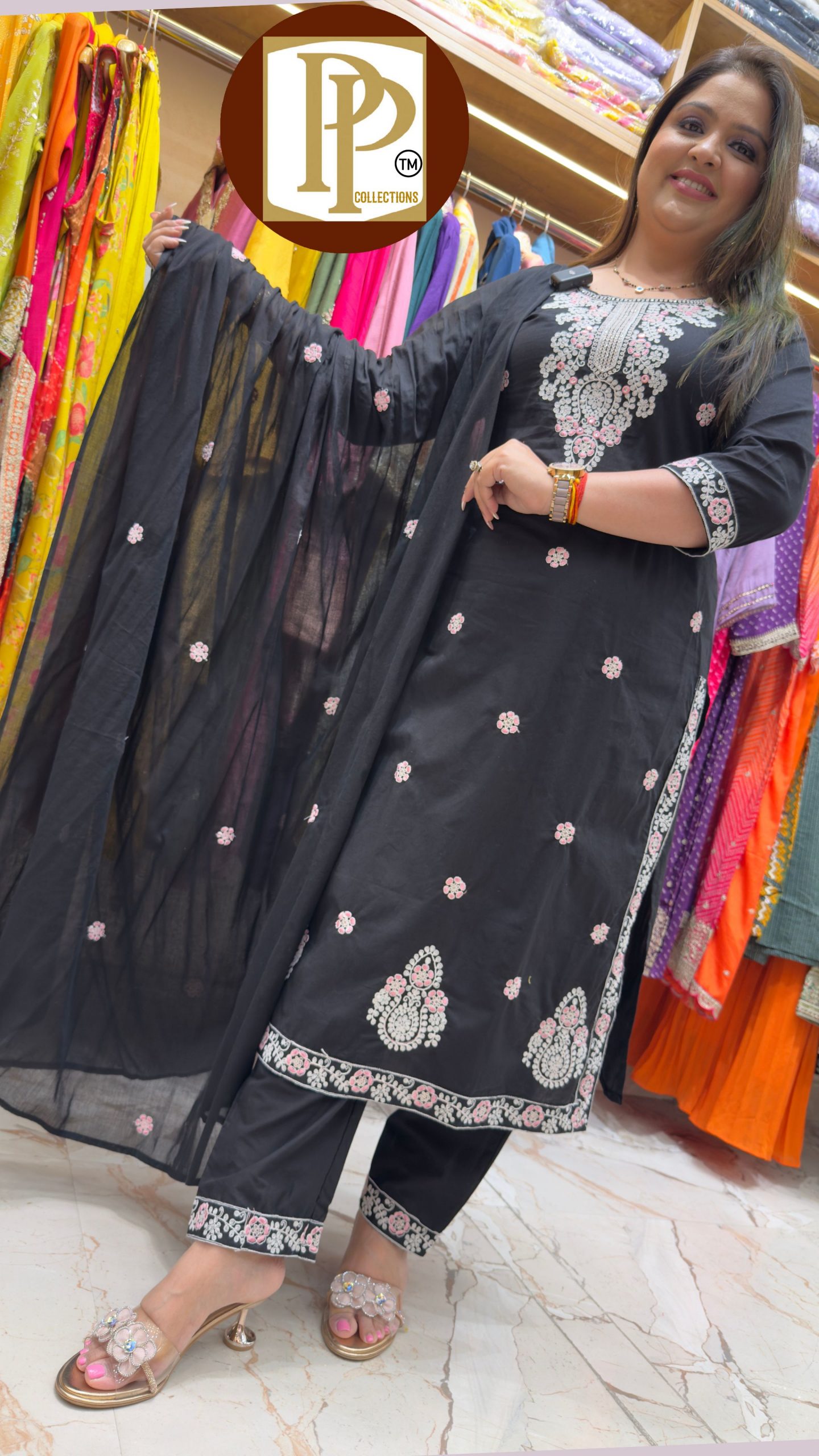 Description : 3piece Pant Set Fabric Type : Rayon Style : Straight Set Work Type : All Over Thread Work With Matching Dupatta.