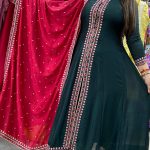 Attractive 3pc silk front slit cut pant set with thread work on front of the kurta with matching thread work on borders of kurta & sleeves with matching plain silk pant with matching thread work on all over the dupatta.