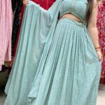 Attractive 3pc lehenga styled skirt crop top with heavy chikankari & hand work on all over the dress with matching thread work on skirt with can can attached with matching dupatta.