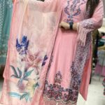 Attractive 3pc pakistani pant set with hand & thread work on all over the kurta & laces work on sleeves & kurta borders with matching plain pant with matching digital print dupatta.