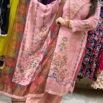 Out of StockAttractive 3pc cotton pant set with hand work on upper part with print pattern on all over the kurta with matching plain pants & contrast digital print pattern on all over the dupatta.
