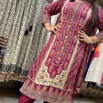 Out of StockAttractive 3pc crepe pant set with hand work on upper part with digital print pattern on all over the kurta with matching plain pants & matching dupatta.