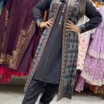 Attractive 3pc woollen pant shrug set with hand work on inner with printed pattern on all over the jacket with matching print also on pant borders.