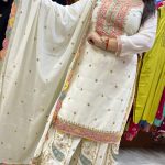 Attractive 3pc silk divider set with hand & thread work on all over the kurta with matching work also on the divider with matching work also on borders of the dupatta.