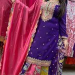 Out of StockAttractive 3pc silk skirt set with thread & hand work on upper part with matching work also on borders of kurta & sleeves with matching work also on skirt & silk dupatta borders.