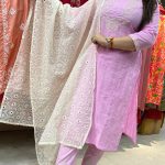 Out of StockAttractive 3pc cotton lurex pant set with thread & hand work on upper part with matching work on pant with contrasting shifli cotton dupatta.