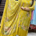 Attractive 3pc silk pant set with hand work on upper part & digital print pattern on all over the Kurta with matching plain pant with matching digital print on all over the dupatta.