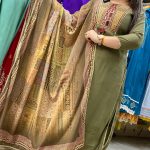Attractive 3pc silk pant set with hand & original mirror work on upper part with matching tulip pants & digital print pattern on all over the dupatta.