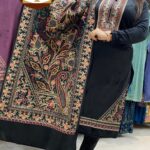 Attractive 3pc premium velvet shawl set with hand & thread work on upper part & borders of the kurta with plain velvet pants with extremely heavy kadhai & hand work on all over the velvet shawl.