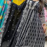 Attractive 3pc cotton anarkali pant set with hand & laces work on all over the kurta with matching hakooba chikankari work also on sleeves & kurta borders with matching work on cotton dupatta.