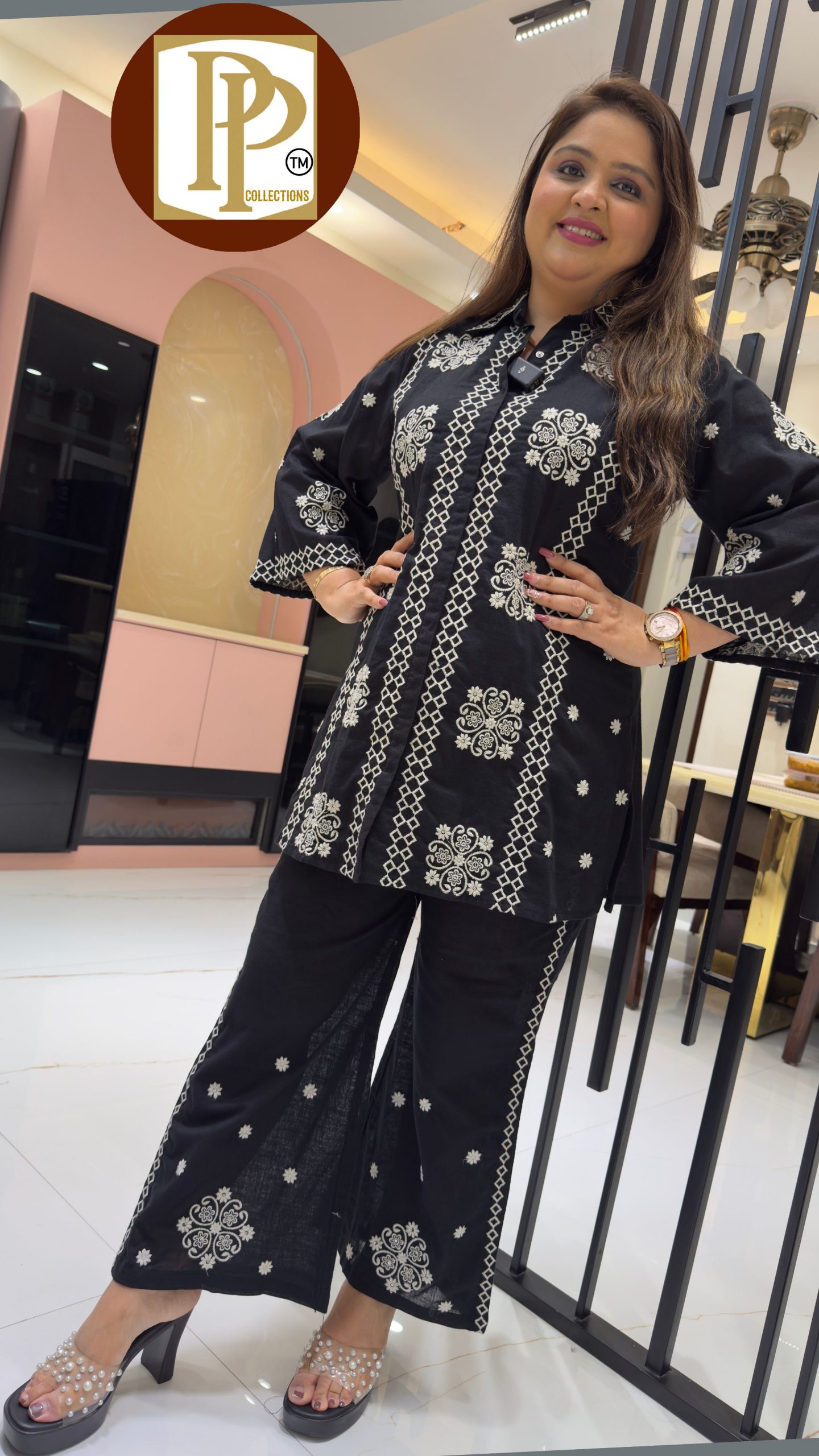 Description : 2piece Plazzo Set Fabric Type : Cotton Style : Co-ord Sets Work Type : Full Thread Work.