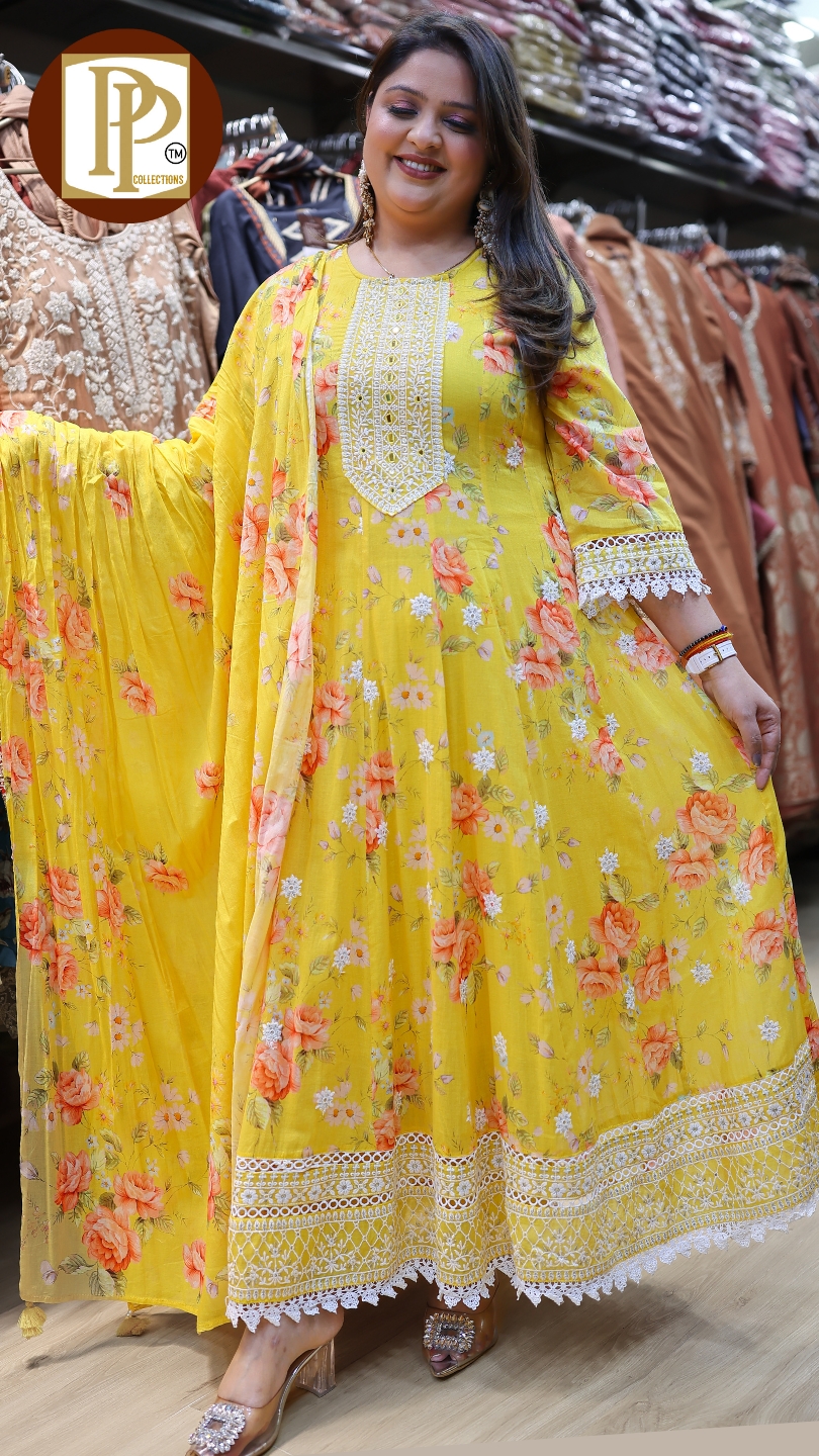 Work Type : all over flower print Full threadwork lakhnavi threadwork in anarkali with matching pants & dupatta .Â