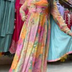 Attractive 3pc chinnon digital printed naira cut with original mirror work around the pads with digital print on all over the kurta with matching plain afghani pants & dupatta.