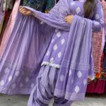 Attractive 3pc cotton patiala salwar set with block & sparkle printed pattern on all over the kurta with matching striped print patiala salwar with matching cotton dupatta.