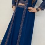 Out of StockAttractive 3pc georgette crop top set with big swrovski stones work on coty, skirt & outer jacket with western outlook fot the entire outfit with matching swarovski work also on sleeves.