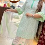 Out of StockAttractive 3pc cotton pakistani palazzo set with chikankari work on all over the kurta with matching laces work on palazzo borders with matching laces work on shiffon dupatta.
