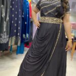 Out of StockAttractive chinnaun single piece gown with drape look with zari work on upper part with matching work on border of the palla with matching zari work on borad border belt.