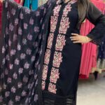 Out of StockAttractive georgette 3pc pant set with thread work on all over the kurta with plain pant with digital print pattern on all over the dupatta with laces work on kurta & dupatta borders.