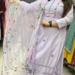 Attractive cotton 3pc pant set with hand & thread work on upper part with plain pant with brush paint pattern on dupatta.