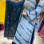 Attractive silk 3pc palazzo set with hand work on upper part with lehriya print pattern on kurta with plain palazzo with hand & foil mirror work on dupatta.