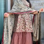 Attractive muslin 3pc front slit cut sharara set with light hand & print pattern on kurta with matching print pattern on sharara & dupatta.