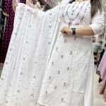Attractive cotton lurex 3pc divider set with hand & original mirror work on upper part with shifli work on kurta with shifli work on divider border with print pattern all over the dupatta.