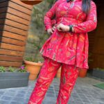 Attractive muslin 2pc cord set with print pattern on top with matching print pattern on pant with print pattern on belt.
