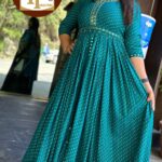 Attractive single piece rayon gown with front slit cut with attached inner with kamar band & original mirror work on front part with plain dupatta & block print pattern all over the dress.