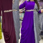 Out of StockAttractive crepe single piece cowl dress with printed pattern attached dupatta with hand work on waist belt & upper part on the dress.