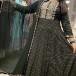 Attractive rayon 3pc anarkali pant set with hand,thread & original mirror work on upper part with block print pattern on kurta with thread & foil mirror work on pant borders with matching thread & foil mirror work on dupatta borders.