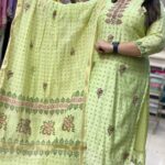 Attractive silk 3pc pant set with hand & thread work on upper part with print pattern on kurta with plain pant with matching print pattern on dupatta.