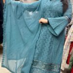 Out of StockAttractive cotton 3pc pant set with shifli work all over the kurta with bell sleeves with plain afghani pant with organza thread patch work on kurta borders with thread work on dupatta .