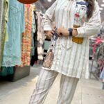 Attractive cotton muslin 2pc coord set with hand work on top with sippy work on all over the top & pant with striped print pattern on top & pant.