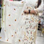 Attractive cotton 3pc pant set with thread work on all over the kurta with plain pant with paint brush print pattern on dupatta.