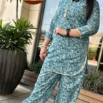 Out of StockAttractive cotton 2pc pathani coord set with hand work on collar with laces borders on top with matching print & laces work on pathani pant.