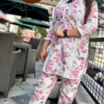Out of StockAttractive cotton 2pc coord set with laces work on top with print pattern all over the coord set with matching work also on printed pant borders .