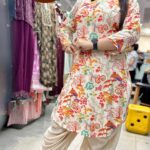 Attractive muslin 2pc collar style coord set with digital print all over the top with plain dhoti & work on borders of dhoti.