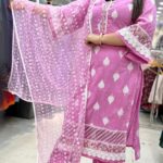 Attractive 3pc cotton pakistani collar style suit with white thread work on all over the kurta with laces work on kurta borders with printed afghani pant with thread work on organza dupatta.