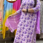 Attractive 3pc cotton pathani pant set with floral block print pattern on all over the kurta with matching print pattern on pathani pant & printed leheriya dupatta.